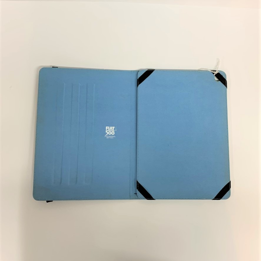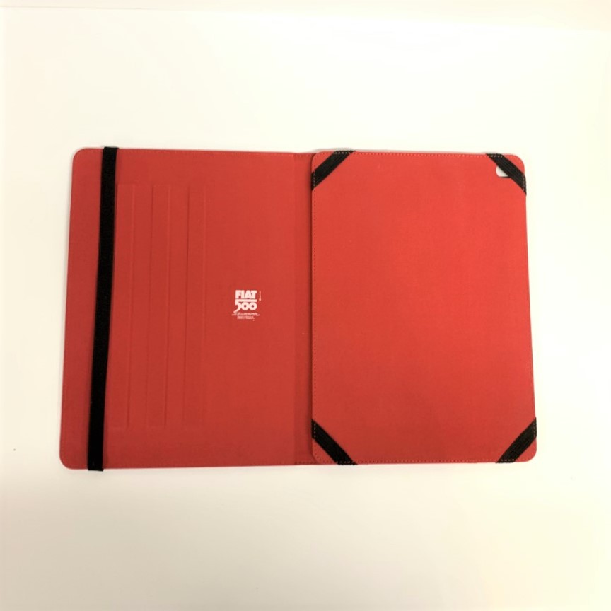 Fiat 500 tablet hoes Materiaal: leer Afmetingen:  tablethoes dicht: 24,5 cm X 7,5 cm, tabblethoes geopend : 35,5 cm X 24,5 cm. Verkrijgbaar in 2 kleuren: blauw en rood.