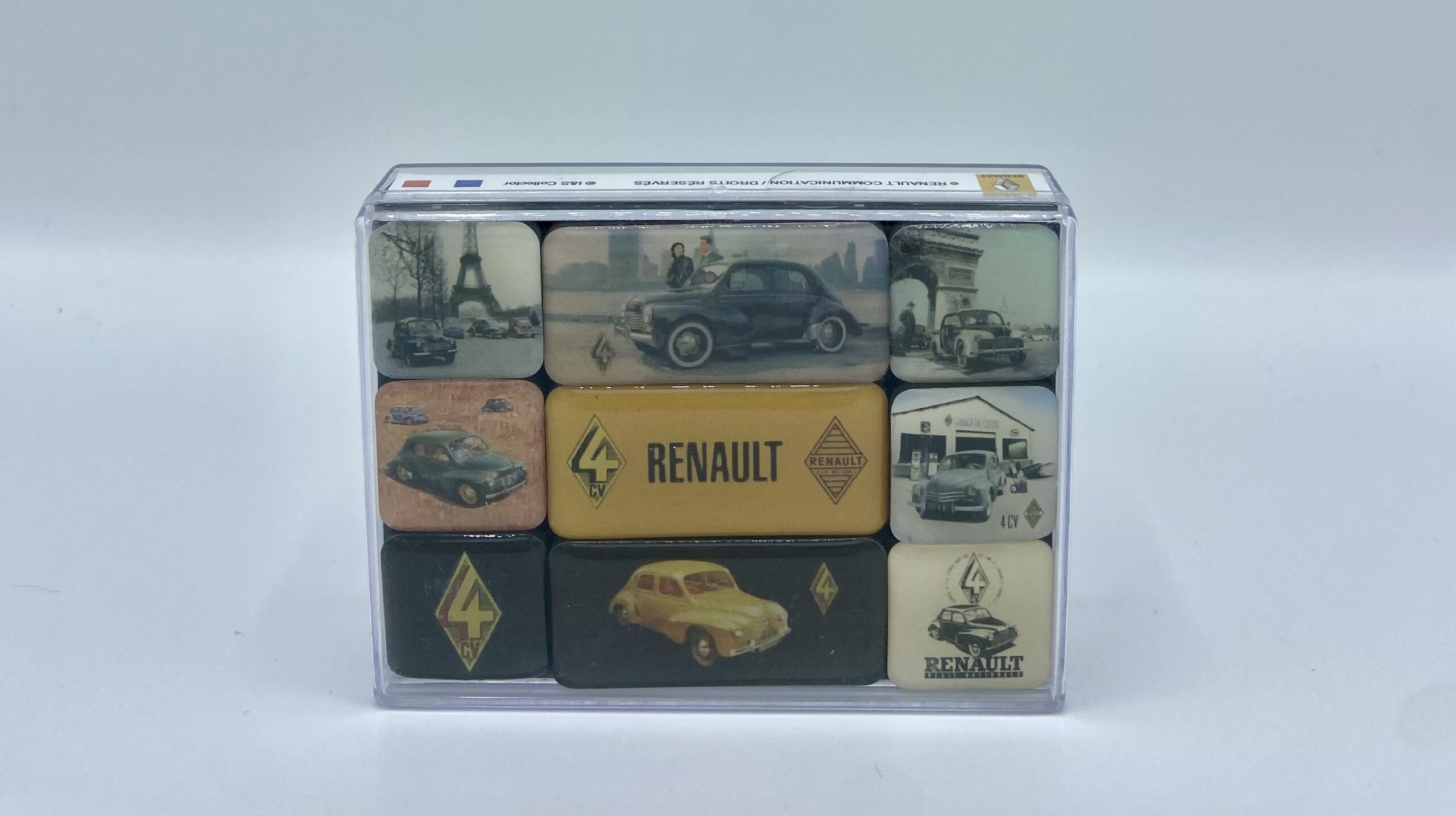 Renault 4 mageneten set bestaande uit 9 verschillende magneten. Afmetingen magneten: Kleine magneten:  ± 2 x 2 cm Grote magneten: ± 4 cm x 2 cm De doos heeft een afmeting van 9 cm x 7 cm