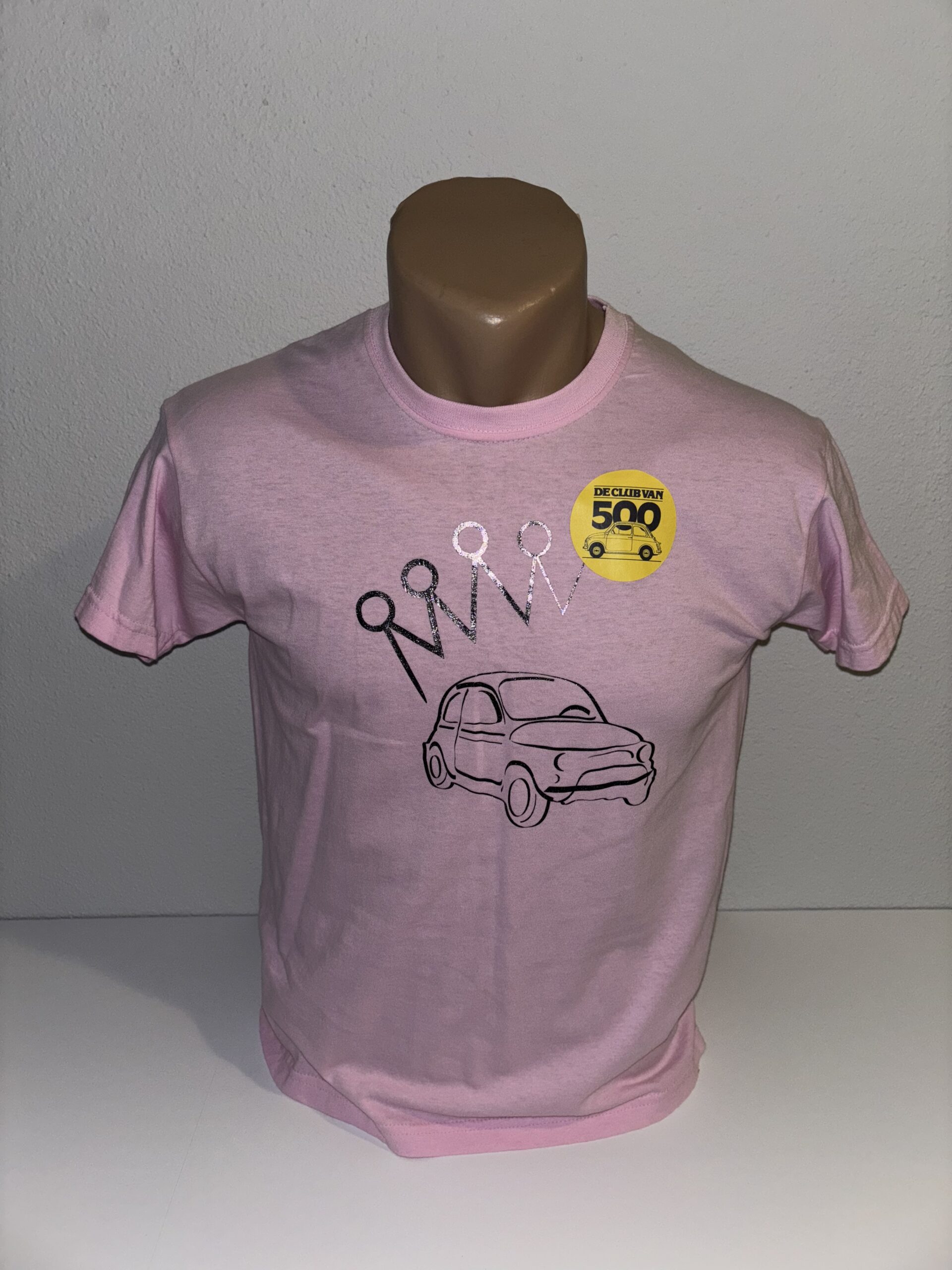 Roze kinder T-shirt met Club van 500 logo en leuke bedrukking. kinder shirts vallen groot