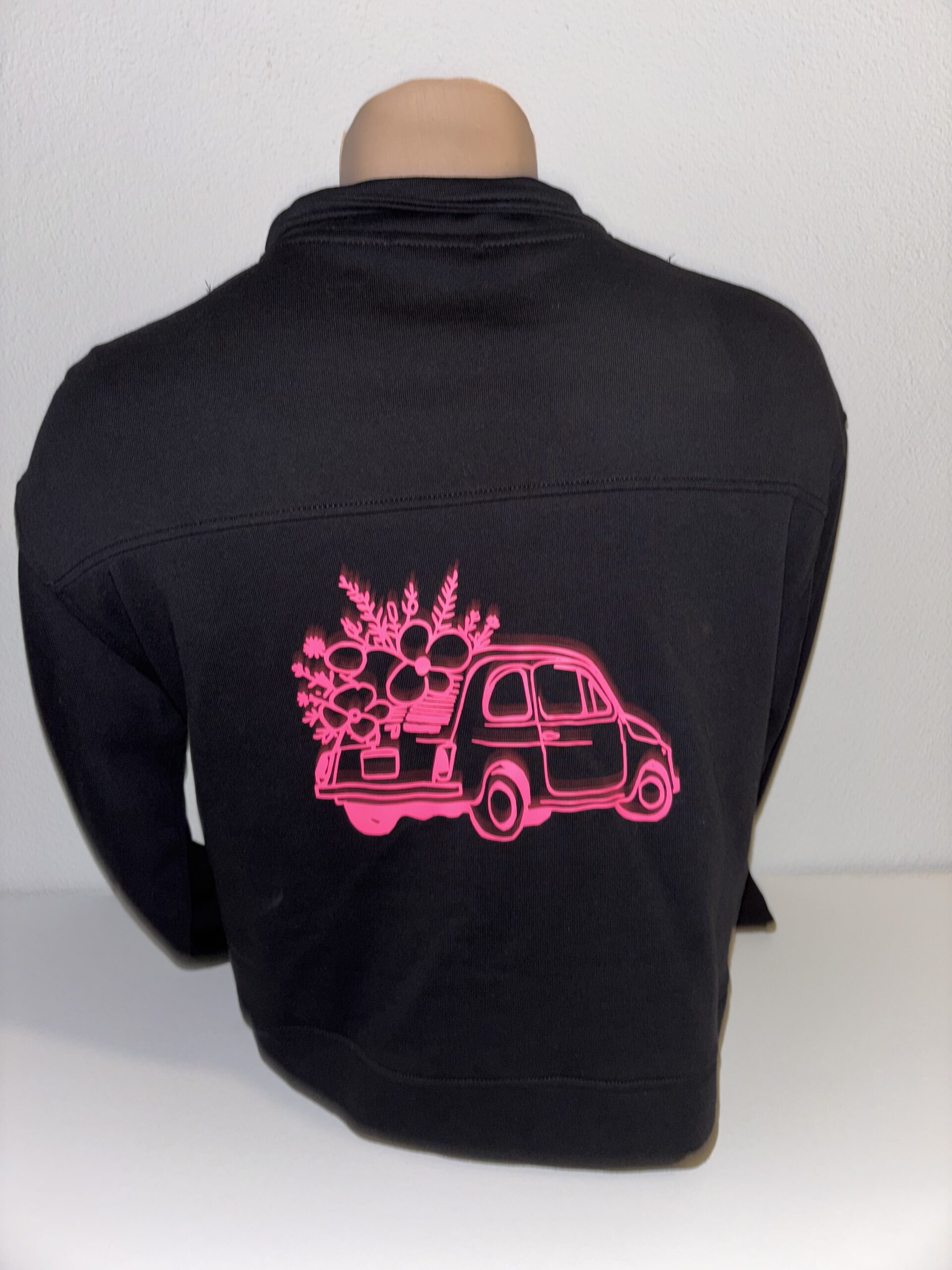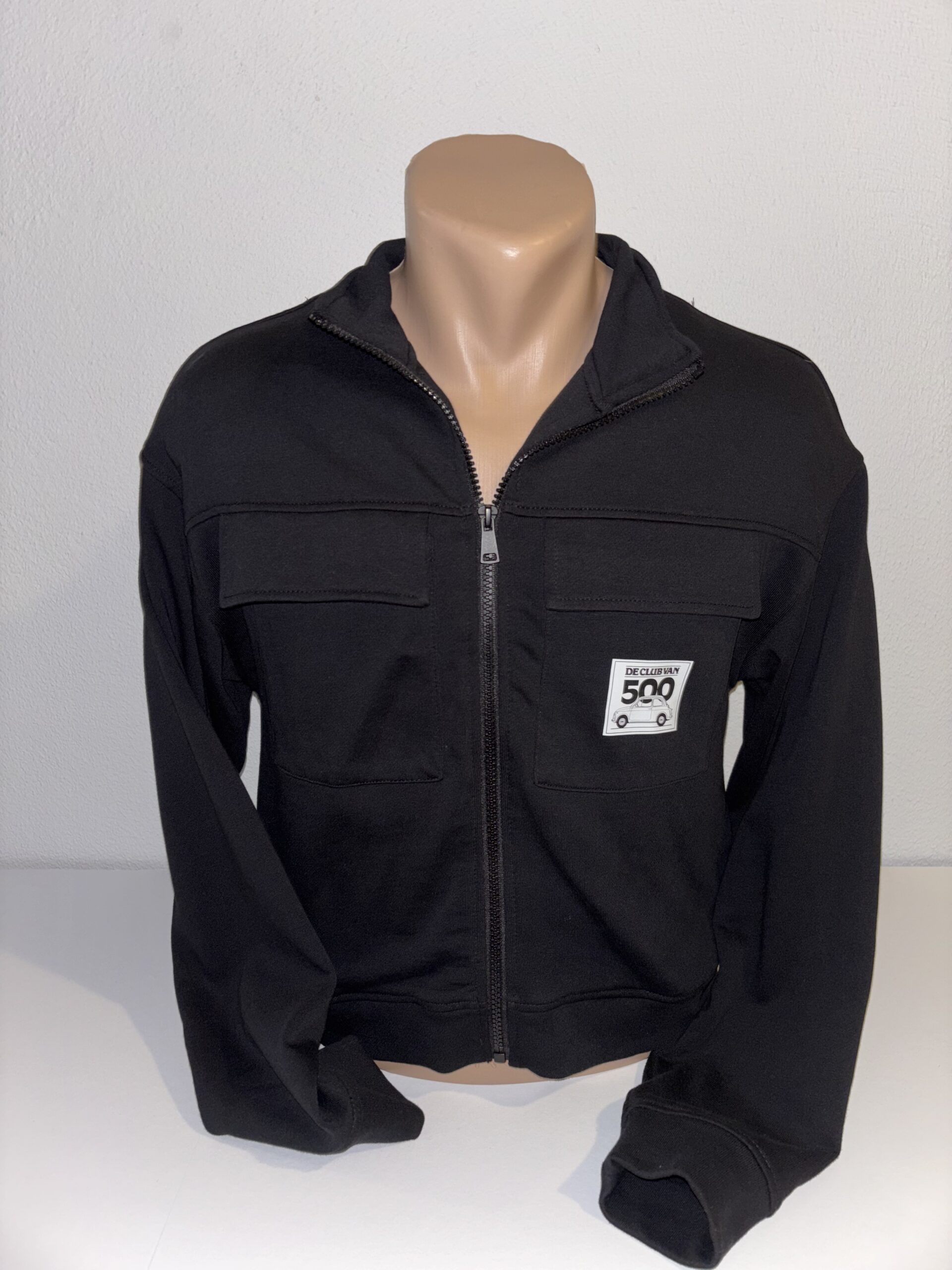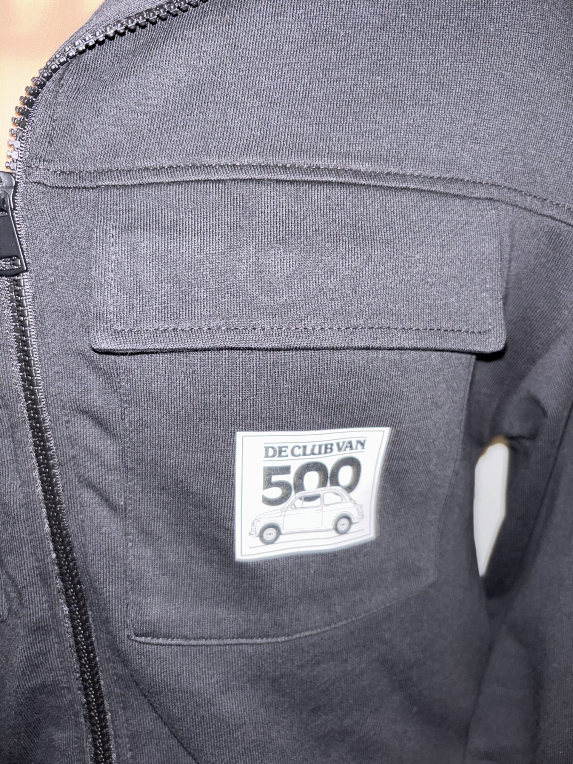 Zwart jasje/vest met een Fiat 500 afbeelding op de achterkant. Wit Club van 500 logo op de voorkant.