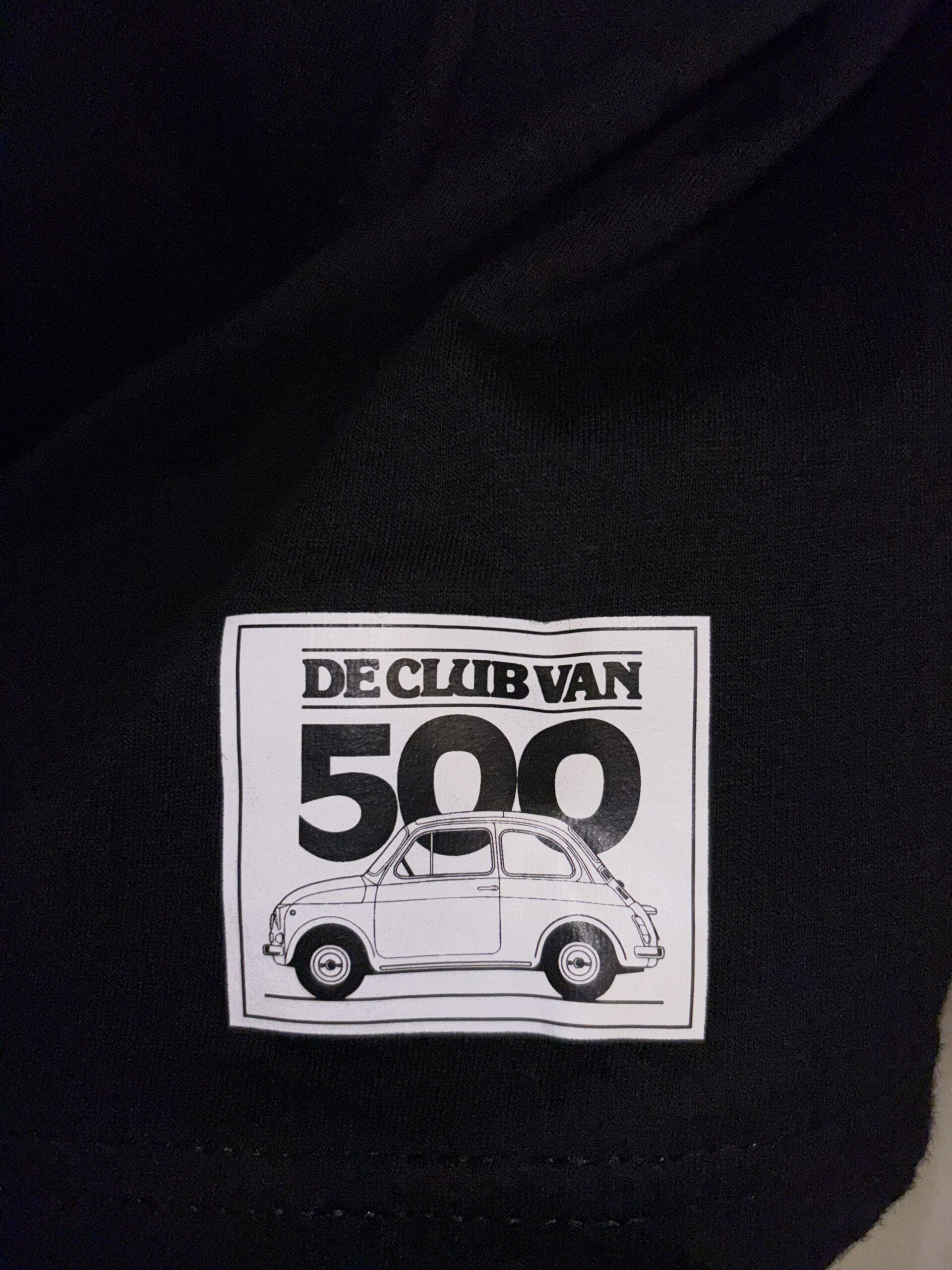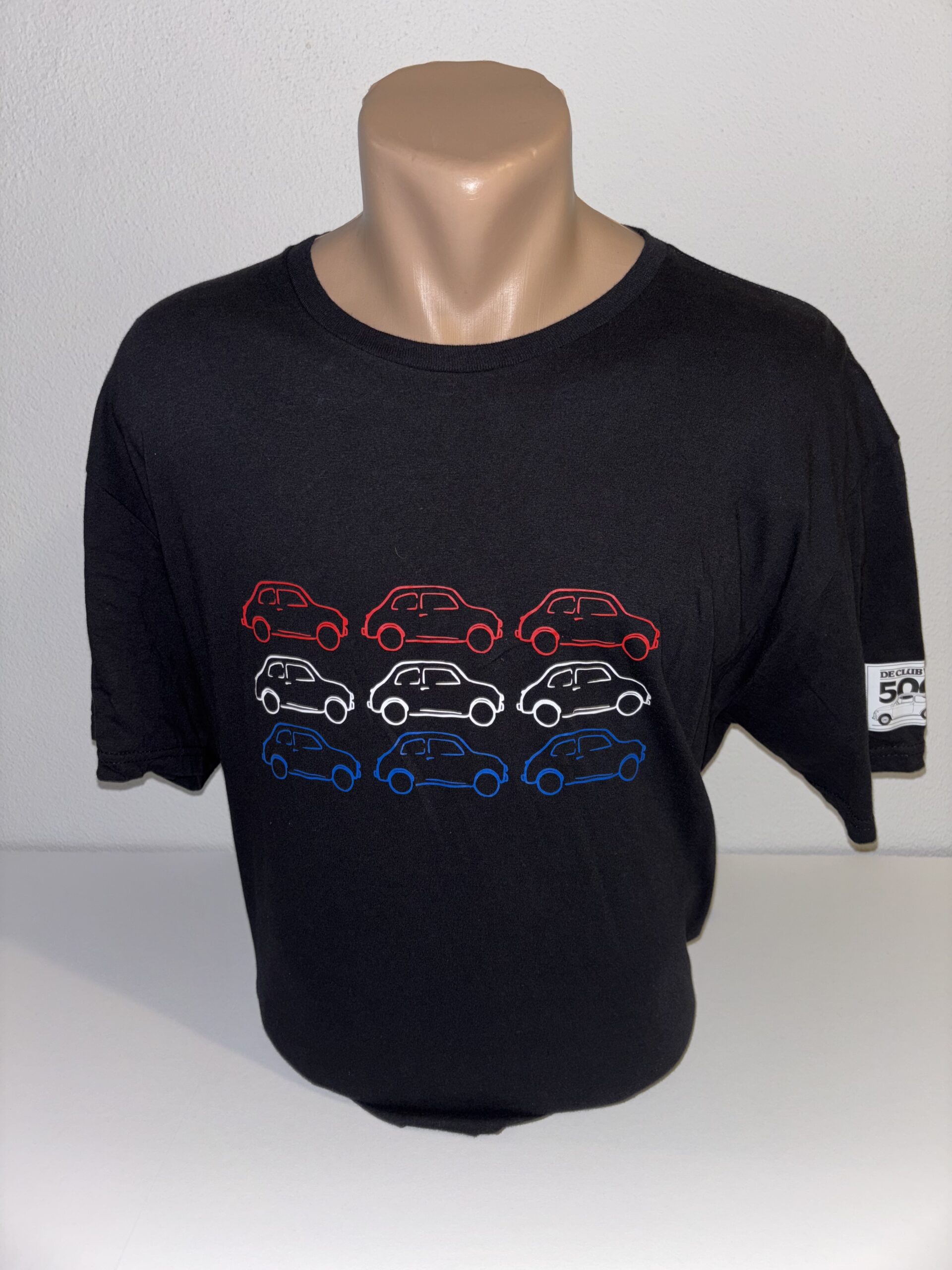 Zwart T-shirt met rood wit blauwe Fiatjes en Fiat 500 logo op de mauw. unisex